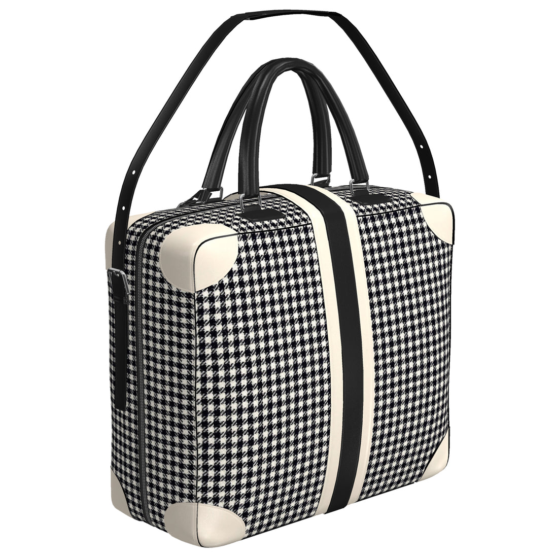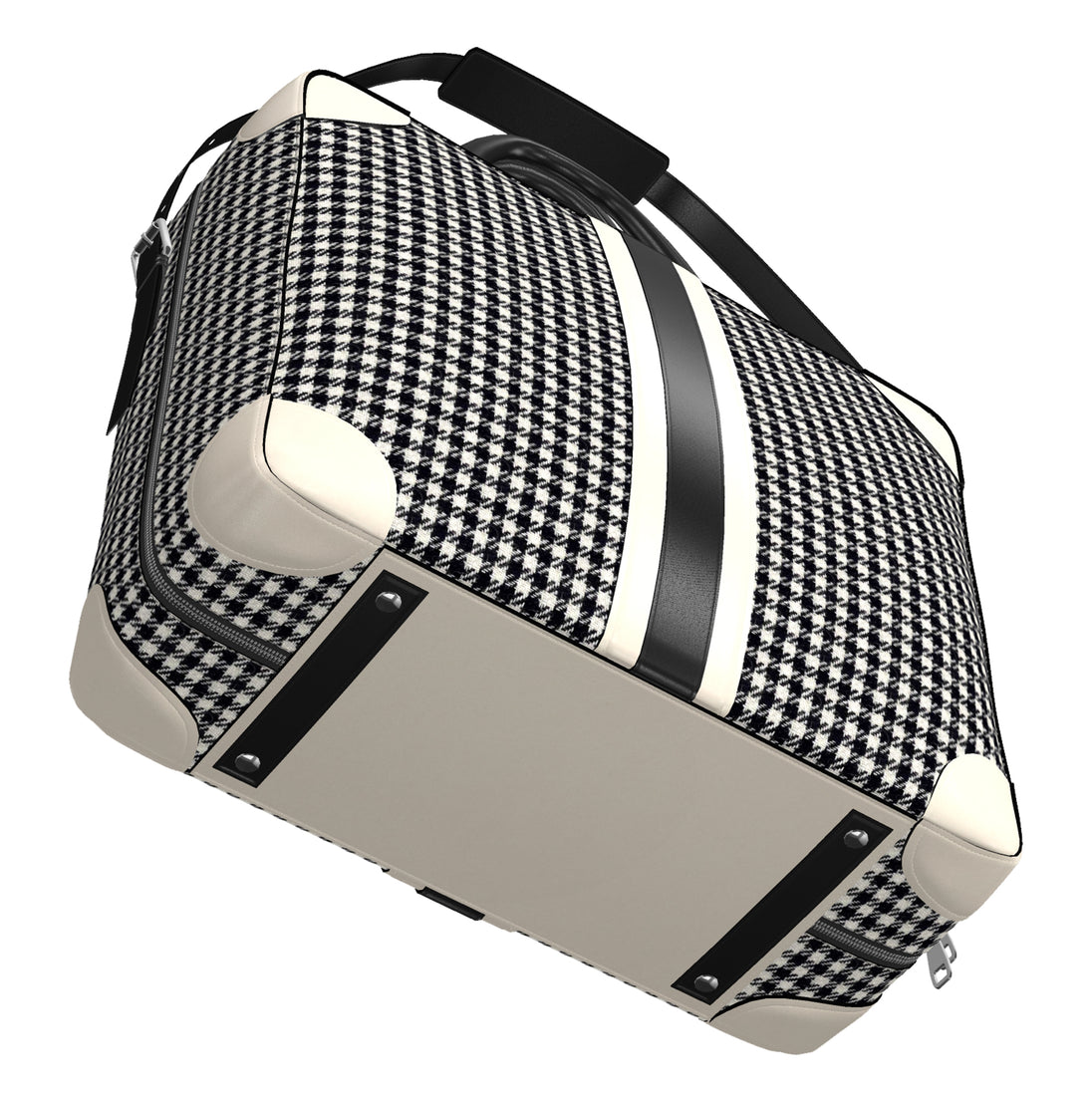 Black & White Houndstooth Satorial sides, inside black fabric liner, Porcelain & Black painted leather trim and handles.