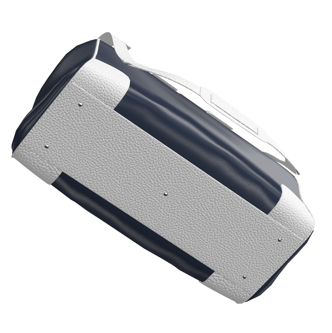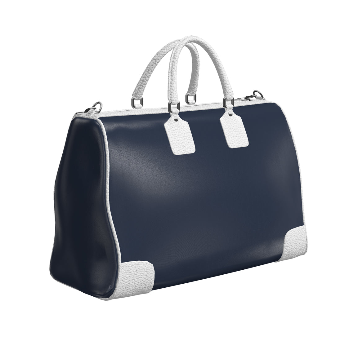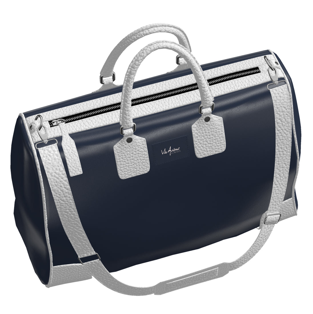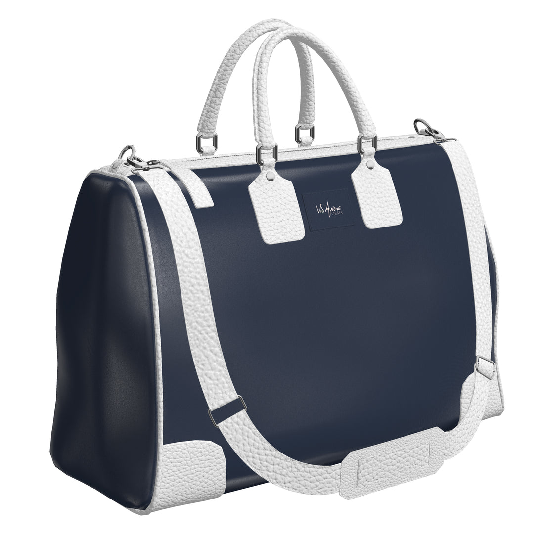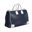 Official Via Avione® Weekender Bag Navy Blue & Snow White Leather sides, handles, and trim.